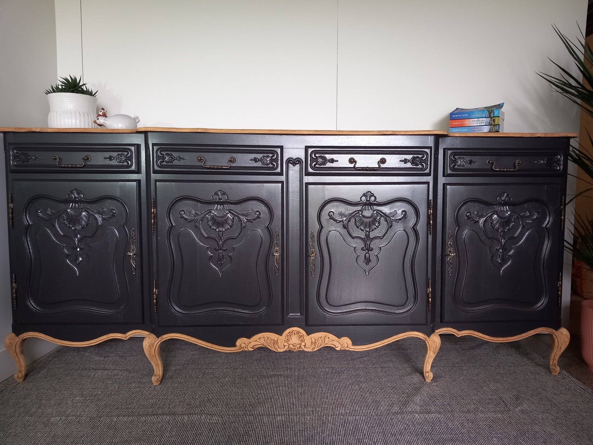Massief eiken dressoir, opgeknapt en zwart geverfd met eiken accenten blank gelaten. Bovenstuk zit er los op.