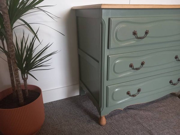 Massief eiken ladenkast, opgeknapt en in het olijfgroen geschilderd. Deze kast heeft 3 lades afgewerkt met prachtig origineel bloemen beslag. Bovenblad opgeschuurd en behandeld met vernis.