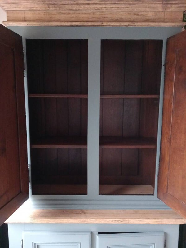 Buffetkast eik in de kleur Blue Pine. Kast is in 2 delen. Van onder 1 legplank en van boven 2 legplanken. Kast heeft heel veel opbergruimte.