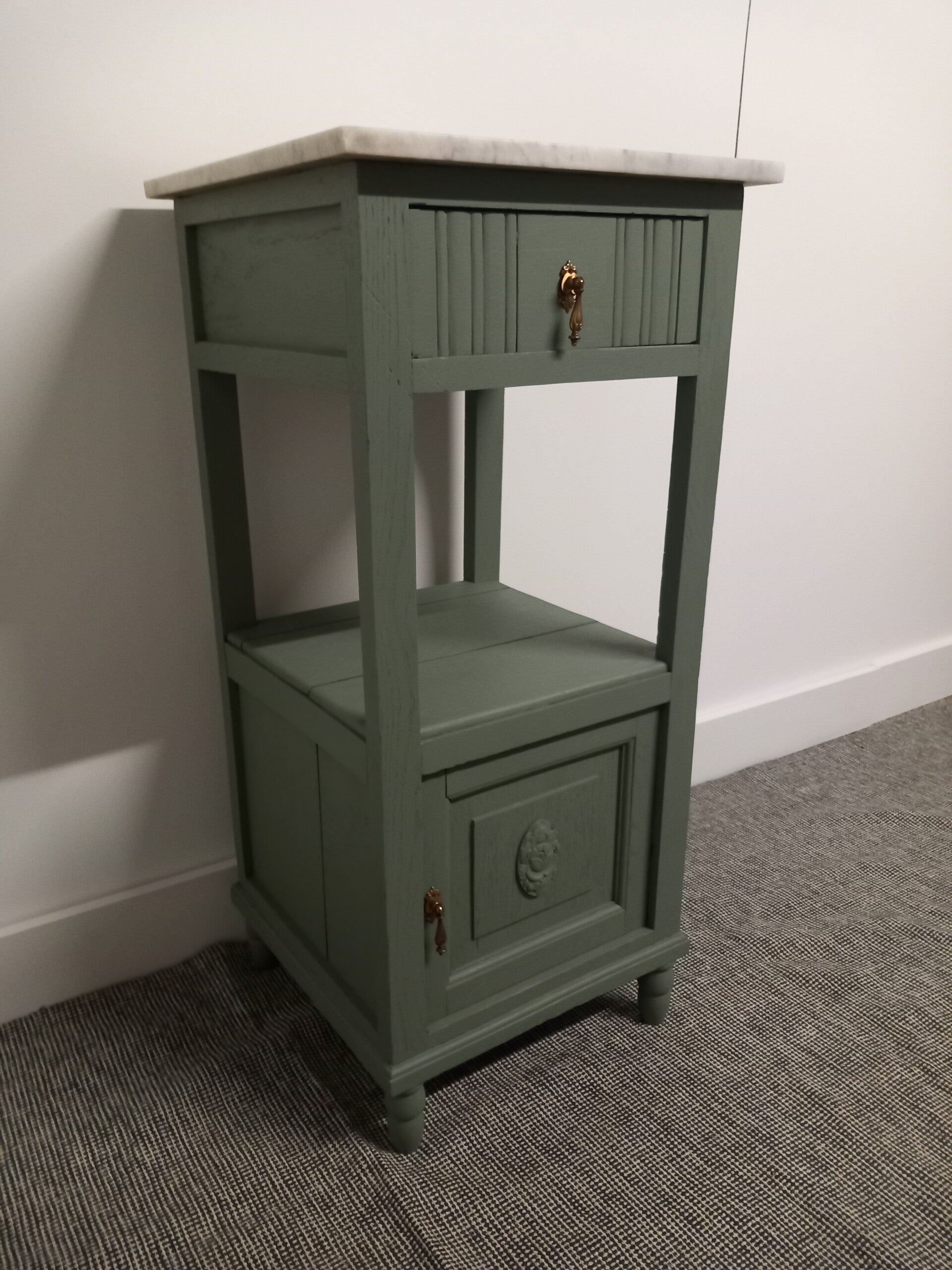 Oud kastje met marmeren blad, heel leuk als nachtkastje, gangkastje of bijzetkastje. Het marmer is licht beschadigd (vlekjes). Geschilderd in de kleur Carriage House van Fusion mineral paint.