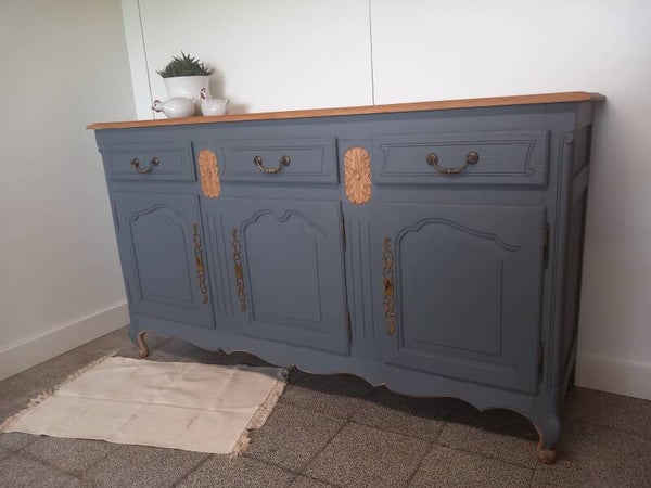 Dit dressoir hebben we in de kleur Soapstone geverfd van Fusion mineral Paint. De kast is afgewerkt met de Clear wax ook van Fusion. We hebben de bloemtjes in het midden blank gelaten omdat we dit een heel leuk accent vonden. De bloemetjes kunnen ook meegeschilderd worden mocht u dat toch willen :). Het is een massief eiken kast, blad volledig opgeschuurd en ook in de wax gezet.
