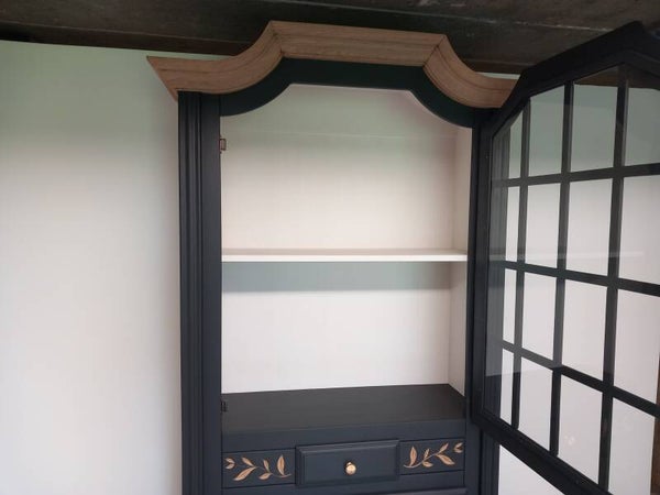 Aparte hoge vitrinekast geschilderd in de kleur Ash van Fusion Mineral Paint. Binnenkant geschilderd in de kleur Victorian Lace ook van Fusion. De bovenkant, de voetjes en de blaadjes behandeld met een wash van Algonquin, daarna de kast in de Clear wax gezet ook allebei van Fusion.