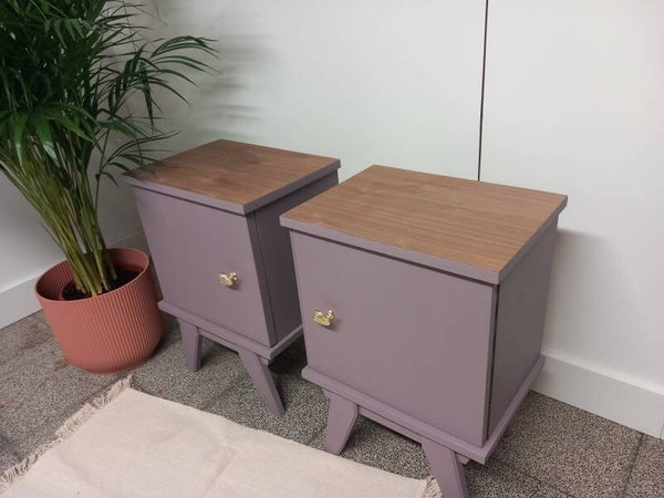 2 Nachtkastjes in de mooie warme licht paarse kleur Lavender Haze van Fusion mineral Paint, afgewerkt met de Clear wax ook van Fusion. De nachtkastjes hebben een nieuw blad gekregen van kastanje fineer. De knopjes zijn goudkleurig en in de vorm van een slakje.