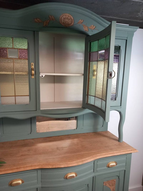Vitrinekast met glas in lood, geschilderd in de kleur Carriage House van Fusion Mineral Paint, afgewerkt met de Clear Wax ook van Fusion. De binnenkant is geschilderd in de kleur Cashmere ook van Fusion. De kast heeft enkele gaatjes aan de achterkant dus wij hebben deze ook behandeld tegen houtworm.
