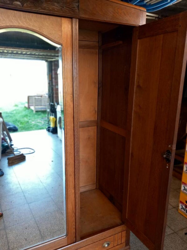Eiken kleerkast/Halkast met heel mooi snijwerk. De kast heeft aan de binnenkant een roede voor kleren aan op te hangen. 3 deuren en 2 lades en heel veel bergruimte.