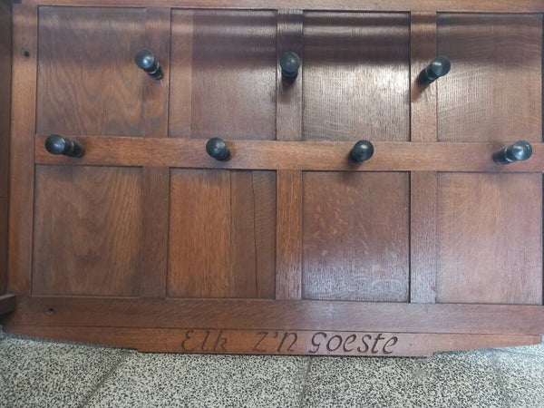 Unieke kapstok met 7 kapstokken, kapstokken kunnen zeker nog veranderd worden. Kapstok heeft een kastje met deurtje en 2 schapjes. Van boven een brede hoedenplank. Onder de kapstok staat Elk z´n Goeste dus denk dat dit misschien een kapstok is die vroeger in een cafe heeft gehangen.