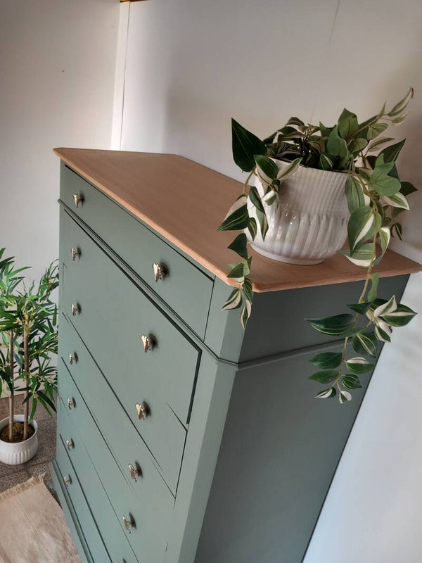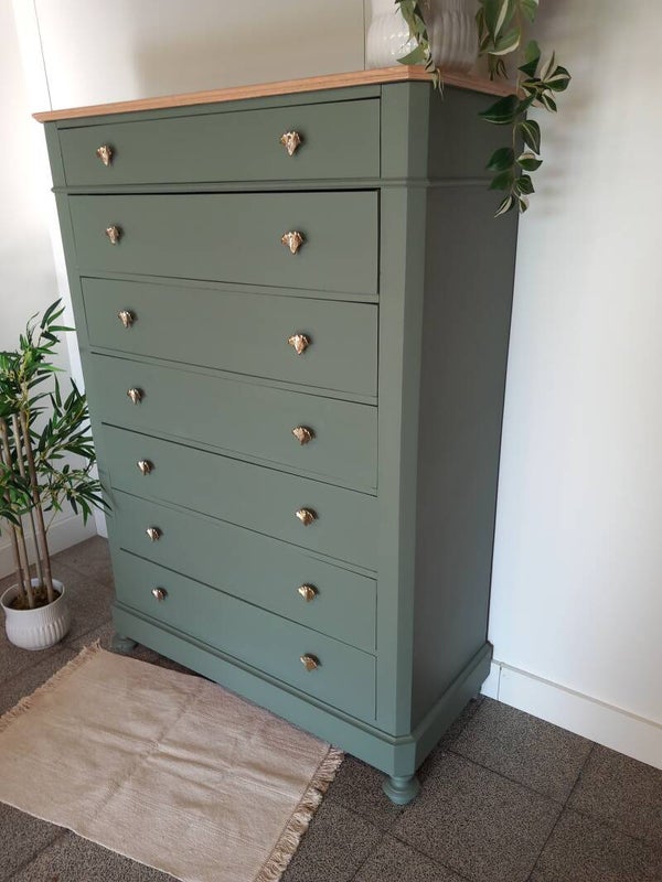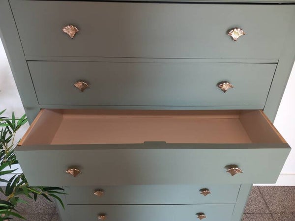 Op het bovenblad hebben we een nieuw eiken fineer gestoken en een massief eiken lijstje om het mooi af te werken. Met maar liefst 7 ruime lades biedt deze kast enorm veel opbergruimte - perfect voor in de huiskamer, hal of slaapkamer. De binnenkant van de lades hebben we geschilderd in de kleur Cashmere ook van Fusion.De subtiele glans van de gouden schelpvormige knopjes zorgt voor een elegante toets, terwijl de strakke lijnen het geheel modern houden. De kast is afgewerkt met de Clear Wax van Fusion.