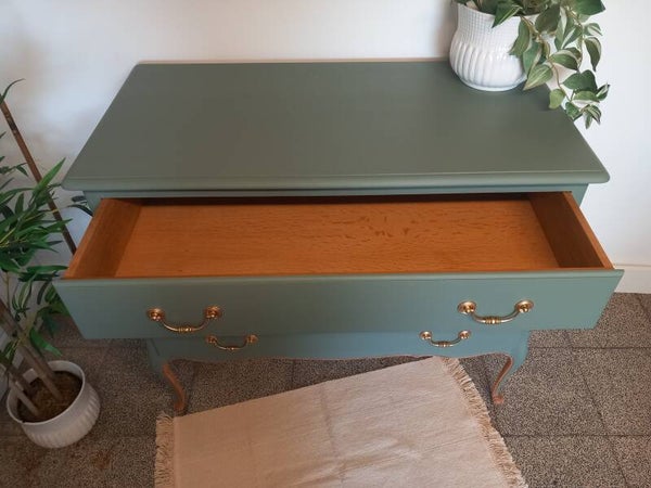 Deze stijlvolle ladekast werd volledig gerestyled met de kleur Carriage House van Fusion Mineral Paint. De klassieke vormgeving met sierlijke poten en de gouden handgrepen geven dit meubelstuk een tijdloze en elegante uitstraling. 3 Ruime lades, gouden beslag en afgewerkt met de Clear Wax ook van Fusion.
