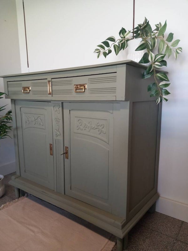 De verfijnde details in het houtwerk werden subtiel geaccentueerd, terwijl de vernieuwde messing handgrepen zorgen voor een warme, elegante toets. Achter de twee deuren vind je praktische opbergruimte, ideaal voor servies, linnengoed of andere spullen die je graag netjes uit het zicht houdt.