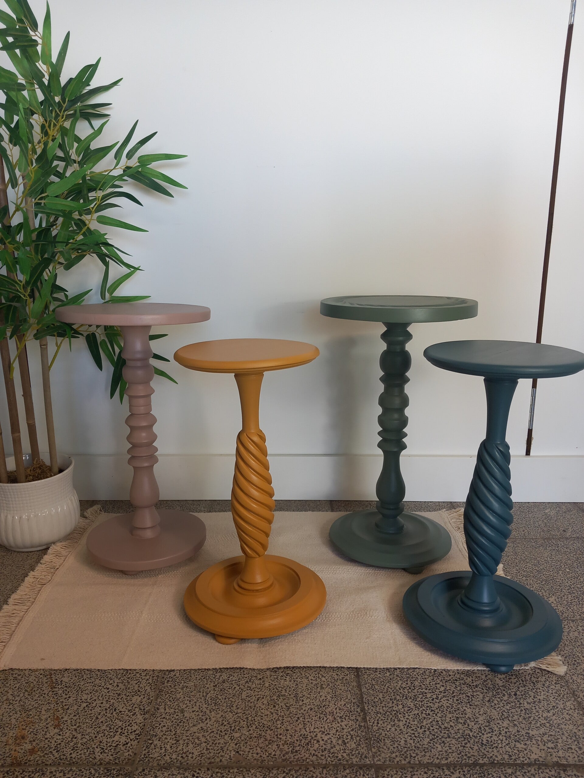 Breng sfeer en karakter in je interieur met deze unieke set van vier handgeschilderde plantentafeltjes. Elk tafeltje heeft zijn eigen vorm en kleur, wat zorgt voor een speels maar harmonieus geheel.